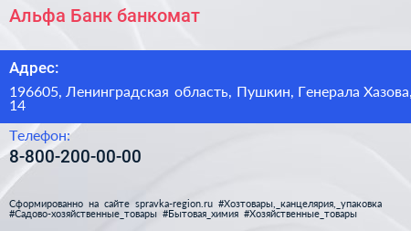 Альфа-Банк, банкомат по адресу 196605, Ленинградская область, Пушкин, Генерала Хазова, 14 в дальнейшем Организация, размещена в следующих категориях: