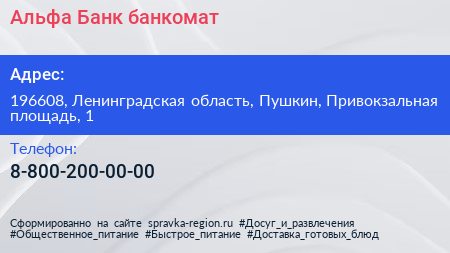 Альфа-Банк, банкомат по адресу 196608, Ленинградская область, Пушкин, Привокзальная площадь, 1 в дальнейшем Организация, размещена в следующих категориях: