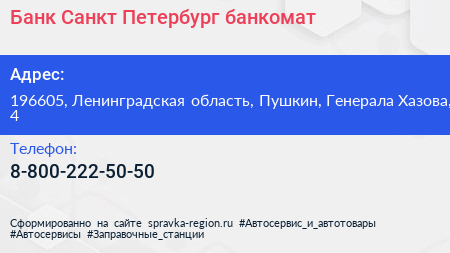 Банк Санкт-Петербург, банкомат по адресу 196605, Ленинградская область, Пушкин, Генерала Хазова, 4 в дальнейшем Организация, размещена в следующих категориях: