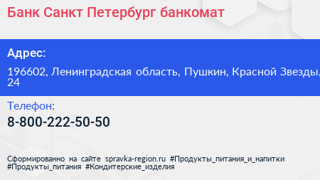 Банк Санкт-Петербург, банкомат по адресу 196602, Ленинградская область, Пушкин, Красной Звезды, 24 в дальнейшем Организация, размещена в следующих категориях: