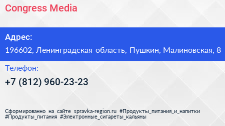 Congress Media по адресу 196602, Ленинградская область, Пушкин, Малиновская, 8 в дальнейшем Организация, размещена в следующих категориях: