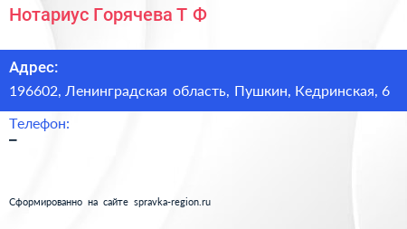 Нотариус Горячева Т.Ф. по адресу 196602, Ленинградская область, Пушкин, Кедринская, 6 в дальнейшем Организация, размещена в следующих категориях: