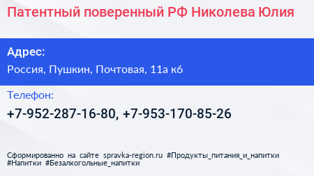 Патентный поверенный РФ Николева Юлия по адресу 11А к6, Почтовая улица, Фёдоровское, Фёдоровское городское поселение, Тосненский район, Ленинградская область, Северо-Западный федеральный округ, 187021, Россия в дальнейшем Организация, размещена в следующих категориях: