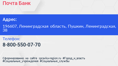 Почта Банк по адресу 196607, Ленинградская область, Пушкин, Ленинградская, 38 в дальнейшем Организация, размещена в следующих категориях: