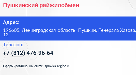 Пушкинский райжилобмен по адресу 196605, Ленинградская область, Пушкин, Генерала Хазова, 12 в дальнейшем Организация, размещена в следующих категориях: