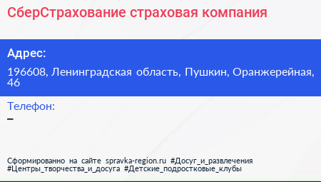 СберСтрахование, страховая компания по адресу 196608, Ленинградская область, Пушкин, Оранжерейная, 46 в дальнейшем Организация, размещена в следующих категориях: