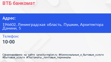 ВТБ, банкомат по адресу 196602, Ленинградская область, Пушкин, Архитектора Данини, 5 в дальнейшем Организация, размещена в следующих категориях: