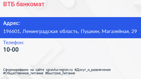 ВТБ, банкомат по адресу 196601, Ленинградская область, Пушкин, Магазейная, 29 в дальнейшем Организация, размещена в следующих категориях: