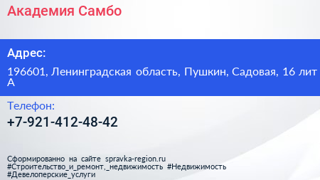 Академия Самбо по адресу 196601, Ленинградская область, Пушкин, Садовая, 16 лит А в дальнейшем Организация, размещена в следующих категориях: