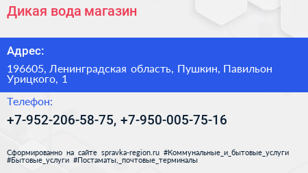 Дикая вода, магазин по адресу 196605, Ленинградская область, Пушкин, Павильон Урицкого, 1 в дальнейшем Организация, размещена в следующих категориях:
