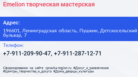 Emelion, творческая мастерская по адресу 196601, Ленинградская область, Пушкин, Детскосельский бульвар, 7 в дальнейшем Организация, размещена в следующих категориях: