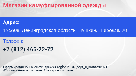 Магазин камуфлированной одежды по адресу 196608, Ленинградская область, Пушкин, Широкая, 20 в дальнейшем Организация, размещена в следующих категориях: