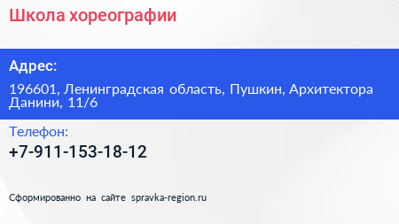 Школа хореографии по адресу 196601, Ленинградская область, Пушкин, Архитектора Данини, 11/6 в дальнейшем Организация, размещена в следующих категориях: