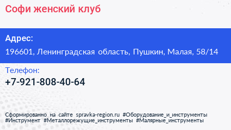 Софи, женский клуб по адресу 196601, Ленинградская область, Пушкин, Малая, 58/14 в дальнейшем Организация, размещена в следующих категориях: