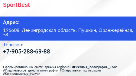 SportBest по адресу 196608, Ленинградская область, Пушкин, Оранжерейная, 54 в дальнейшем Организация, размещена в следующих категориях: