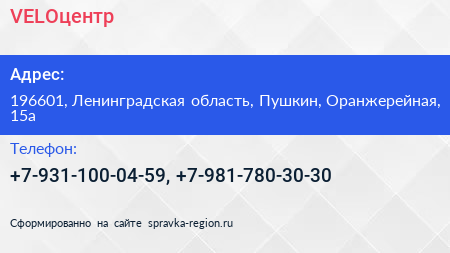 VELOцентр по адресу 196601, Ленинградская область, Пушкин, Оранжерейная, 15а в дальнейшем Организация, размещена в следующих категориях: