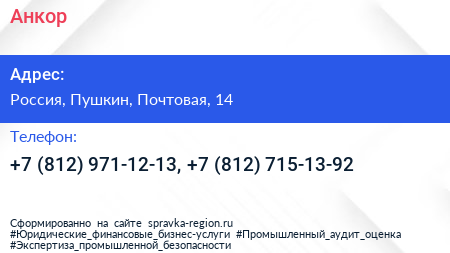 Анкор по адресу 12, Почтовая улица, Фёдоровское, Фёдоровское городское поселение, Тосненский район, Ленинградская область, Северо-Западный федеральный округ, 187021, Россия в дальнейшем Организация, размещена в следующих категориях: