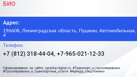 БИО по адресу 196608, Ленинградская область, Пушкин, Автомобильная, 4 в дальнейшем Организация, размещена в следующих категориях: