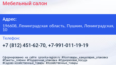 Мебельный салон по адресу 196608, Ленинградская область, Пушкин, Ленинградская, 10 в дальнейшем Организация, размещена в следующих категориях: