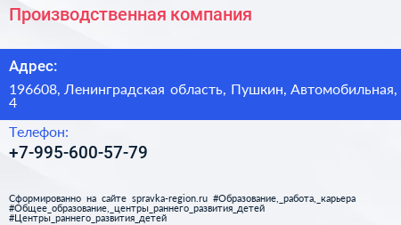 Производственная компания по адресу 196608, Ленинградская область, Пушкин, Автомобильная, 4 в дальнейшем Организация, размещена в следующих категориях: