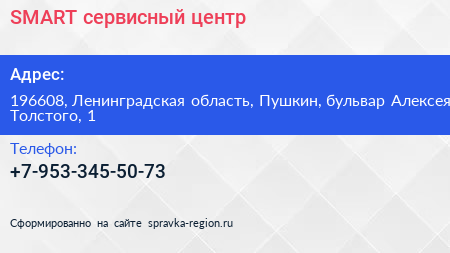 SMART, сервисный центр по адресу 196608, Ленинградская область, Пушкин, бульвар Алексея Толстого, 1 в дальнейшем Организация, размещена в следующих категориях: