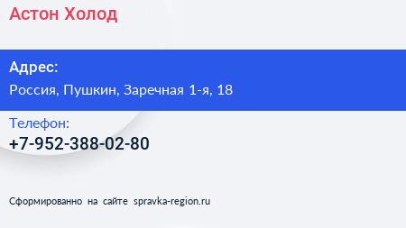 Астон-Холод по адресу 1-я Заречная улица, КП «Фёдоровская усадьба», Фёдоровское, Фёдоровское городское поселение, Тосненский район, Ленинградская область, Северо-Западный федеральный округ, 187046, Россия в дальнейшем Организация, размещена в следующих категориях:
