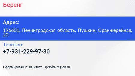 Беренг по адресу 196601, Ленинградская область, Пушкин, Оранжерейная, 20 в дальнейшем Организация, размещена в следующих категориях: