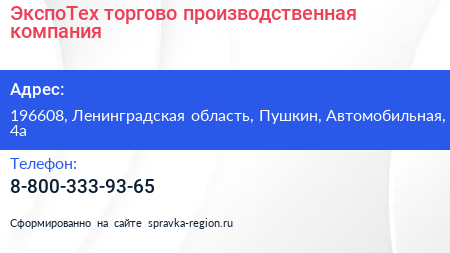 ЭкспоТех, торгово-производственная компания по адресу 196608, Ленинградская область, Пушкин, Автомобильная, 4а в дальнейшем Организация, размещена в следующих категориях: