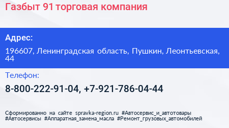 Газбыт-91, торговая компания по адресу 196607, Ленинградская область, Пушкин, Леонтьевская, 44 в дальнейшем Организация, размещена в следующих категориях: