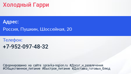Холодный Гарри по адресу 20, Шоссейная улица, Фёдоровское, Фёдоровское городское поселение, Тосненский район, Ленинградская область, Северо-Западный федеральный округ, 187021, Россия в дальнейшем Организация, размещена в следующих категориях: