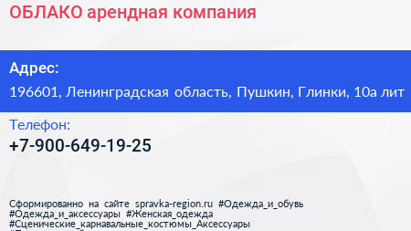 ОБЛАКО, арендная компания по адресу 196601, Ленинградская область, Пушкин, Глинки, 10а лит Г в дальнейшем Организация, размещена в следующих категориях: