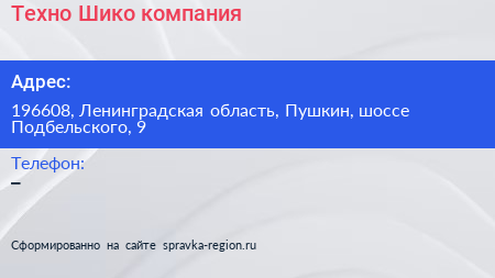 Техно Шико, компания по адресу 196608, Ленинградская область, Пушкин, шоссе Подбельского, 9 в дальнейшем Организация, размещена в следующих категориях: