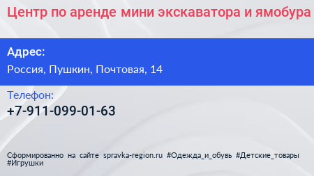 Центр по аренде мини-экскаватора и ямобура по адресу 12, Почтовая улица, Фёдоровское, Фёдоровское городское поселение, Тосненский район, Ленинградская область, Северо-Западный федеральный округ, 187021, Россия в дальнейшем Организация, размещена в следующих категориях: