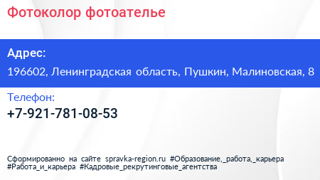 Фотоколор, фотоателье по адресу 196602, Ленинградская область, Пушкин, Малиновская, 8 в дальнейшем Организация, размещена в следующих категориях: