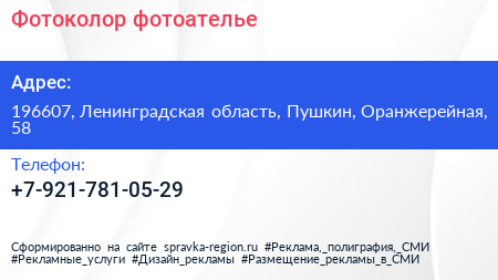 Фотоколор, фотоателье по адресу 196607, Ленинградская область, Пушкин, Оранжерейная, 58 в дальнейшем Организация, размещена в следующих категориях: