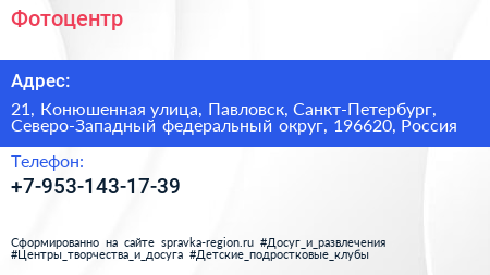 Фотоцентр по адресу 21, Конюшенная улица, Павловск, Санкт-Петербург, Северо-Западный федеральный округ, 196620, Россия в дальнейшем Организация, размещена в следующих категориях:
