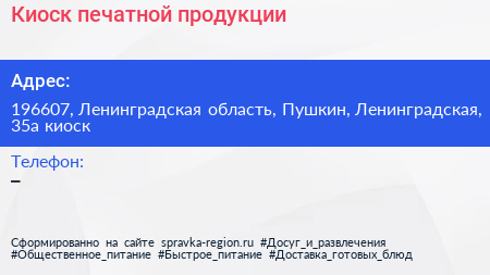 Киоск печатной продукции по адресу 196607, Ленинградская область, Пушкин, Ленинградская, 35а киоск в дальнейшем Организация, размещена в следующих категориях: