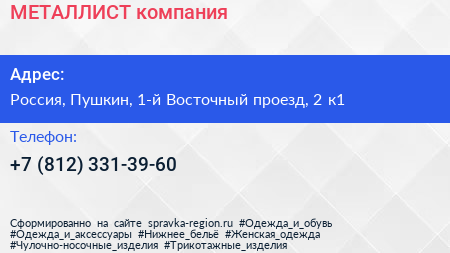 Для связи с организацией воспользуйтесь номером телефона: +7 (812) 331-39-60. Ежедневно с 00:00 до 24:00, вы можете обратиться в эту организацию.