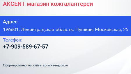 AKCENT, магазин кожгалантереи по адресу 196601, Ленинградская область, Пушкин, Московская, 25 в дальнейшем Организация, размещена в следующих категориях:
