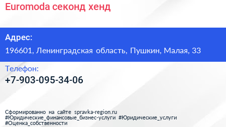 Euromoda, секонд-хенд по адресу 196601, Ленинградская область, Пушкин, Малая, 33 в дальнейшем Организация, размещена в следующих категориях: