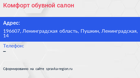 Комфорт, обувной салон по адресу 196607, Ленинградская область, Пушкин, Ленинградская, 14 в дальнейшем Организация, размещена в следующих категориях: