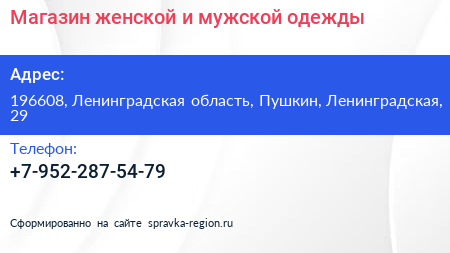 Магазин женской и мужской одежды по адресу 196608, Ленинградская область, Пушкин, Ленинградская, 29 в дальнейшем Организация, размещена в следующих категориях: