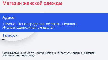 Магазин женской одежды по адресу 196608, Ленинградская область, Пушкин, Железнодорожная улица, 24 в дальнейшем Организация, размещена в следующих категориях: