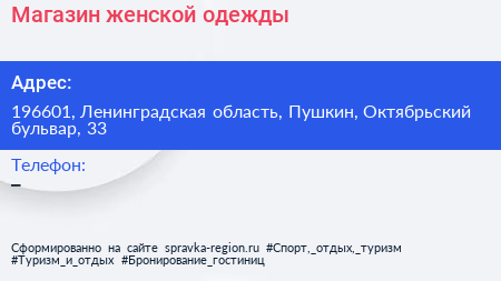 Магазин женской одежды по адресу 196601, Ленинградская область, Пушкин, Октябрьский бульвар, 33 в дальнейшем Организация, размещена в следующих категориях: