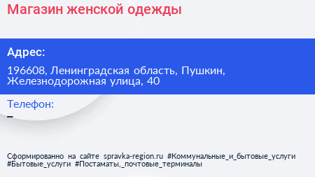 Магазин женской одежды по адресу 196608, Ленинградская область, Пушкин, Железнодорожная улица, 40 в дальнейшем Организация, размещена в следующих категориях: