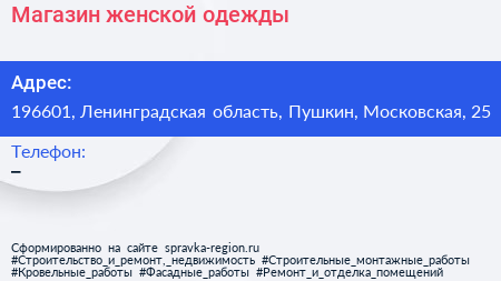 Магазин женской одежды по адресу 196601, Ленинградская область, Пушкин, Московская, 25 в дальнейшем Организация, размещена в следующих категориях: