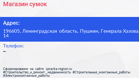 Магазин сумок по адресу 196605, Ленинградская область, Пушкин, Генерала Хазова, 14 в дальнейшем Организация, размещена в следующих категориях:
