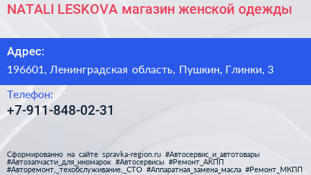 NATALI LESKOVA, магазин женской одежды по адресу 196601, Ленинградская область, Пушкин, Глинки, 3 в дальнейшем Организация, размещена в следующих категориях: