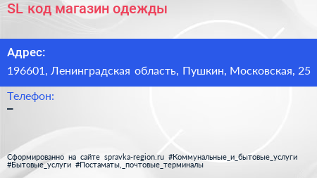 SL код, магазин одежды по адресу 196601, Ленинградская область, Пушкин, Московская, 25 в дальнейшем Организация, размещена в следующих категориях: