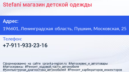 Stefani, магазин детской одежды по адресу 196601, Ленинградская область, Пушкин, Московская, 25 в дальнейшем Организация, размещена в следующих категориях: